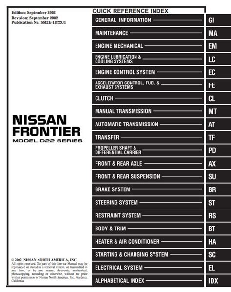 Currently you are looking for an 2002 Frontier D22 Service And Repair Manual example that we provide here in some form of document formats like as PDF, Doc, Strength Point, and also images that will make it simpler for you to create an 2002 Frontier D22 Service And Repair Manual yourself. For a clearer look, you can open a few examples below. All the examples about 2002 Frontier D22 Service And Repair Manual on this website, we get from many sources so you can create a better record of your own.When the search you obtain here does not match what you are searching for, please utilize the search feature that we have got provided here. You are free to download anything at all that we provide here, investment decision you won't cost you the particular slightest.