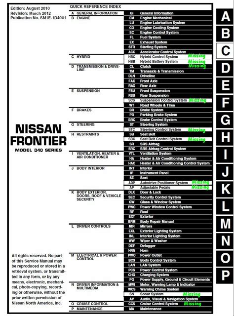 Presently you are looking for an 2011 Nissan Frontier Factory Service Manual example that we provide here inside some type of document formats many of these as PDF, Doc, Power Point, and in addition images that will make it simpler for you to create an 2011 Nissan Frontier Factory Service Manual yourself. For a better look, you may open several examples below. Each of the good examples about 2011 Nissan Frontier Factory Service Manual with this site, we get from many sources so you could create a better record of your own.If the search you get here does not match up what you are looking for, please use the research feature that we possess provided here. You will be free to download anything at all that we provide in this article, it will not cost you the particular slightest.